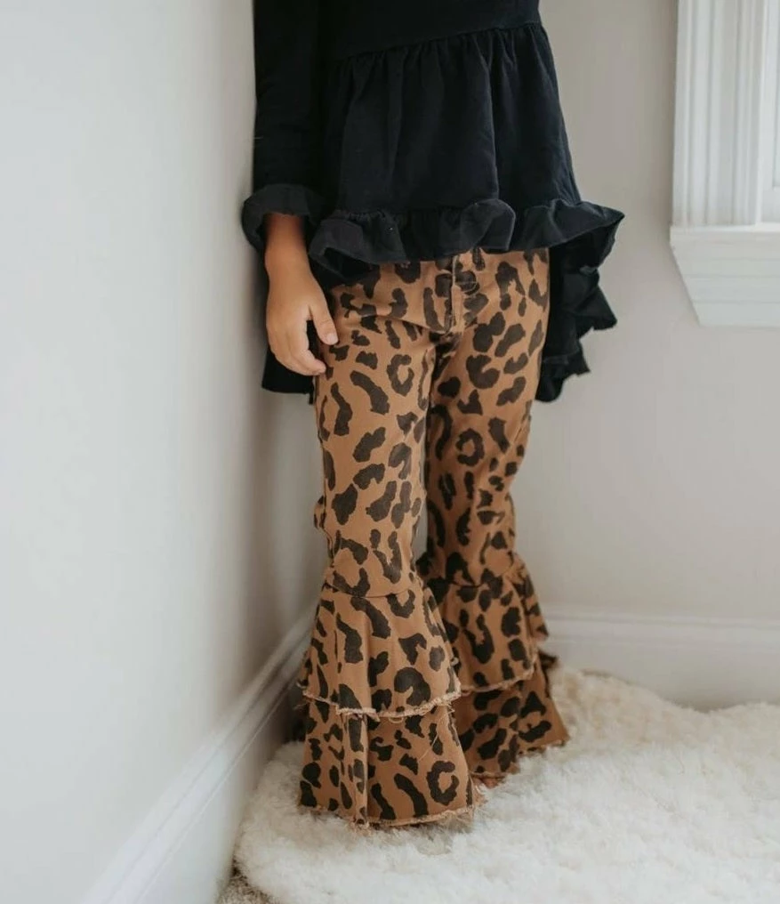 Wholesale โจ Itty Bitty Kid’s Boutique Leopard Double Denim Ruffle Pant ๐ง Girls ๐